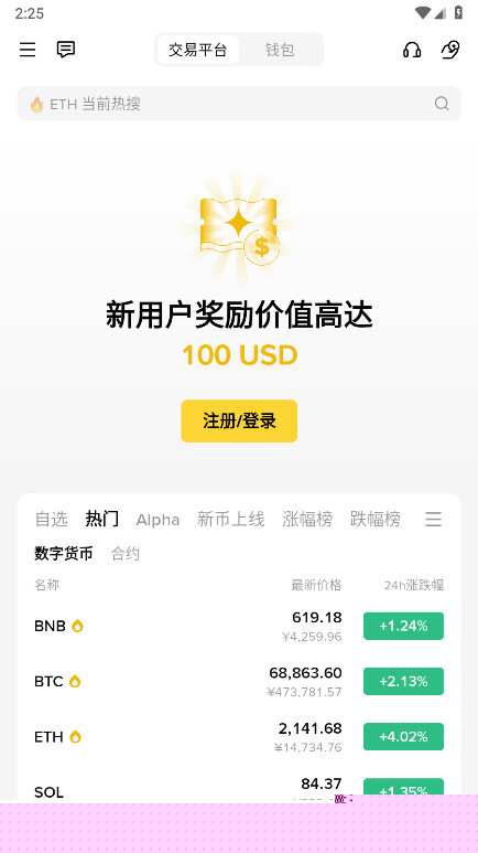 登录个人币安账户后,点击【交易】进入现货交易界面。